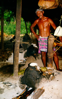 Under a low, grass-roofed shelter, some villagers were distilling firewater from the fruit of a palm tree. They had two clay pots filled with the fermented juice, and had them submerged in hot coals. The boiling mixture was channelled upwards and along about five metres of bamboo pipe, in which it condensed. It was collected as it dripped from the end. We bought 750ml, decanted into one of our empty aqua bottles, for Rp 15,000 (~A$3). The seventy-one-year-old chap who made it assured us that it never made him "mabuk" (drunk). The other villagers told us he was rarely otherwise.