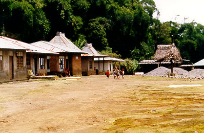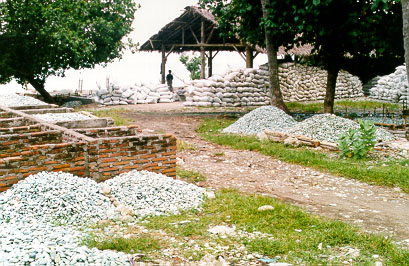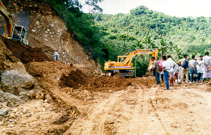 We dined at "one of Ende's best restaurants" (the well-known travel guide, again), and spent a bit of time wondering what Ende's worst restaurants would be like. An hour or so out of Ende we came across a landslide that we had been told about in Bajawa. Asiz pulled in at the head of the short queue. There were two earth movers repairing the hillside. Apparently it had been rectified the day before, but fell down again. Each time an earth mover stopped, locals scuttled back and forth to catch the bemos running shuttles back to Ende, on our side, and Maumere, on the other. The man in charge told us that we would have at least a three-hour wait. After a short look around, we arranged ourselves across the back seat of the Kijang for a snooze. Again personal privacy had no meaning. A stream of young men kept pressing their faces to the window to gawk, and in the end we gave up trying to sleep.