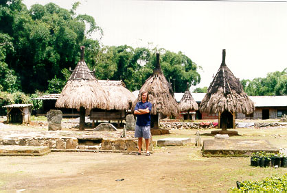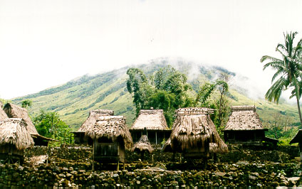 Back at the Hotel Korina, we found Asiz and headed out to the traditional Ngada villages, where wooden male and female structures harken back to the pre-Catholic animist religion. The first town, Langda, consisted of some houses around a muddy square, with a few totems in the centre. The few people around appeared to be very impoverished. Further down the side of the impressive Gunung Inere we stopped to collect some gum leaves, from one of the many eucalypts that abound in Flores. Further still, a car coming back up the hill contained two tourists in the back with a driver, and, in the front passenger seat, a grinning Phillip, who waved to show us that he had ended up with a "catch".