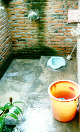 The bungalow was dingy, the electricity generator was "rusak" (broken) and the bathroom, or "mandi" albeit reasonably clean, was as basic as possible. It was attached, but outside the room (usual in Indonesia) and consisted of an Asian-style toilet, and a plastic rubbish bin, which was filled each day with river water. (Helen walked up to the river the second day, and said that she wished she hadn't seen it.) To bathe, one had to ladle cold water over one's self, soap up, and then rinse off.
